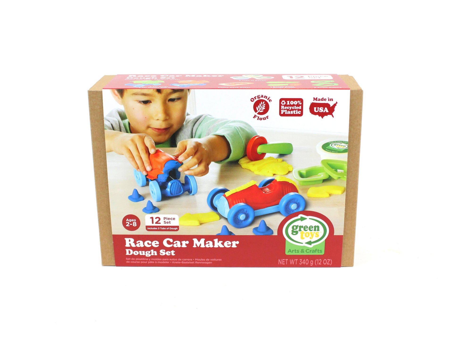 Mold! Customize! Race! This 12-piece set includes everything needed to create endless custom car designs: 2 race car chassis, 2 race car tops, 1 cone maker, 2 arrow molds, 1 rolling cutter, 1 knife, 3 dough tubs.